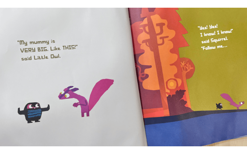 赤ちゃんフクロウが迷子になり、友だちのリスに助けられながらお母さんを探すお話。